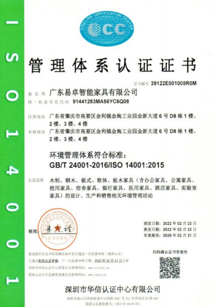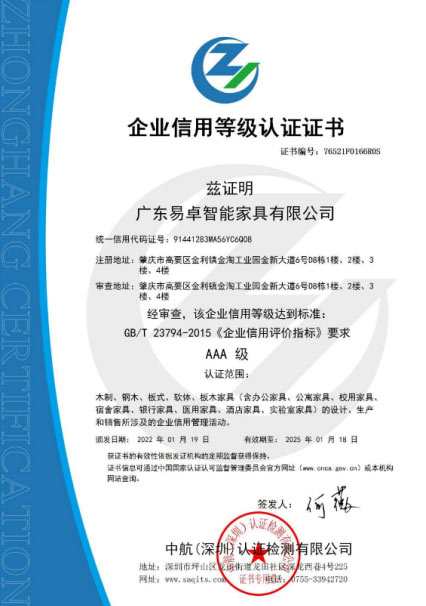 易卓人秉承“執(zhí)著、專注、創(chuàng)新、激情、高效、感恩”的企業(yè)精神,這里聚攏著一批真正熱愛家具的技術精尖的大工匠、設計師,抱著一種“做好一件事”的熱忱,不花力氣做廣告,只花力氣做產品,以利器為翼,創(chuàng)新為魂,憑借強大的技術實力及完善的管理體系獲得,在業(yè)內先后通過了ISO9001質量管理體系認證、ISO14001環(huán)境管理體系認證、ISO45001 職業(yè)健康安全管理體系認證、知識產權管理認證、環(huán)保產品認證、中國環(huán)境標志認證及采用標準產品認證等認證;擁有發(fā)明、外觀、實用性等專利 36 項,并于2017-2019年連續(xù)三年榮獲了“廣東省守合同重信用企業(yè)”稱號、于2019年獲得了“高新技術企業(yè)” 證書及“廣東省著名商標”、“廣東省名牌產品”等榮譽稱號。